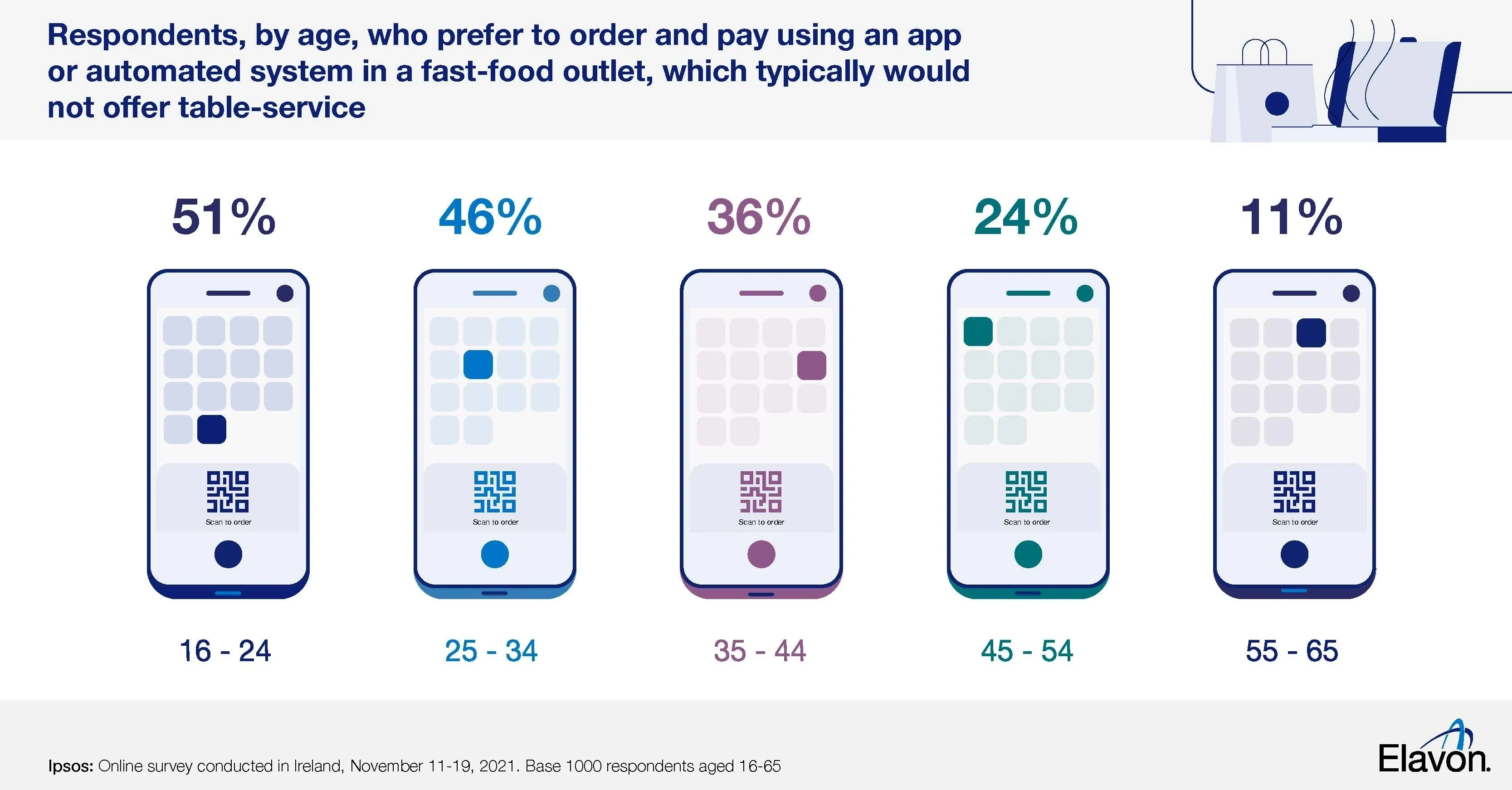 Of that same 55-65 group, 80% prefer to order and pay in a fast food outlet through a member of staff, while more than two in three respondents (69%) aged 45-54 prefer a face-to-face transaction.